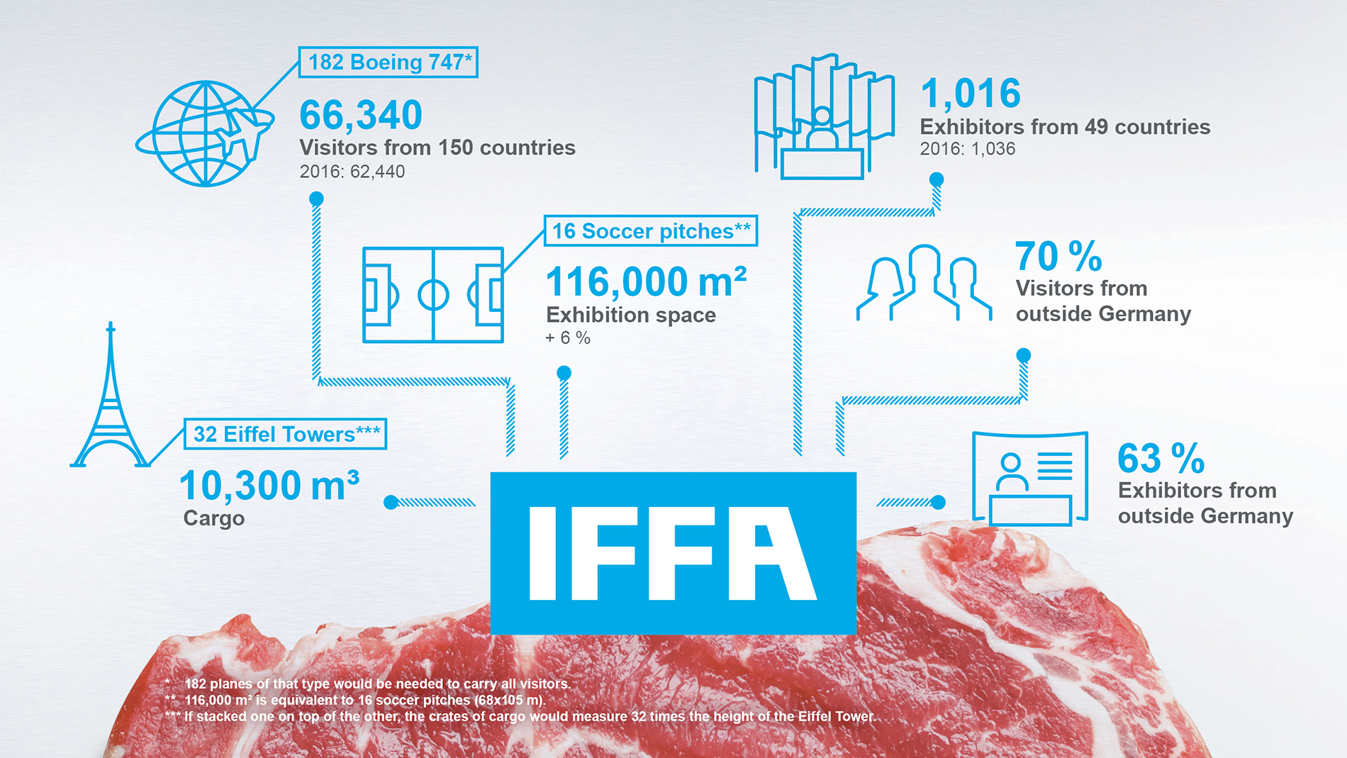 法兰克福肉类加工设备暨肉类食品展为每三年展出一次。一直以来IFFA始终在肉类加工及可替代蛋白质的领域中保持领导性与指标性的国际地位,丰富且独特的展出产品为买家及供应商提供了一个创新、专业的交易平台。IFFA展品分层规划清晰、涵盖范围广泛,从标准的基本生产设施到针对特殊应用领域与制造设备与解决方案,是专业观众锁定本展的主要原因。